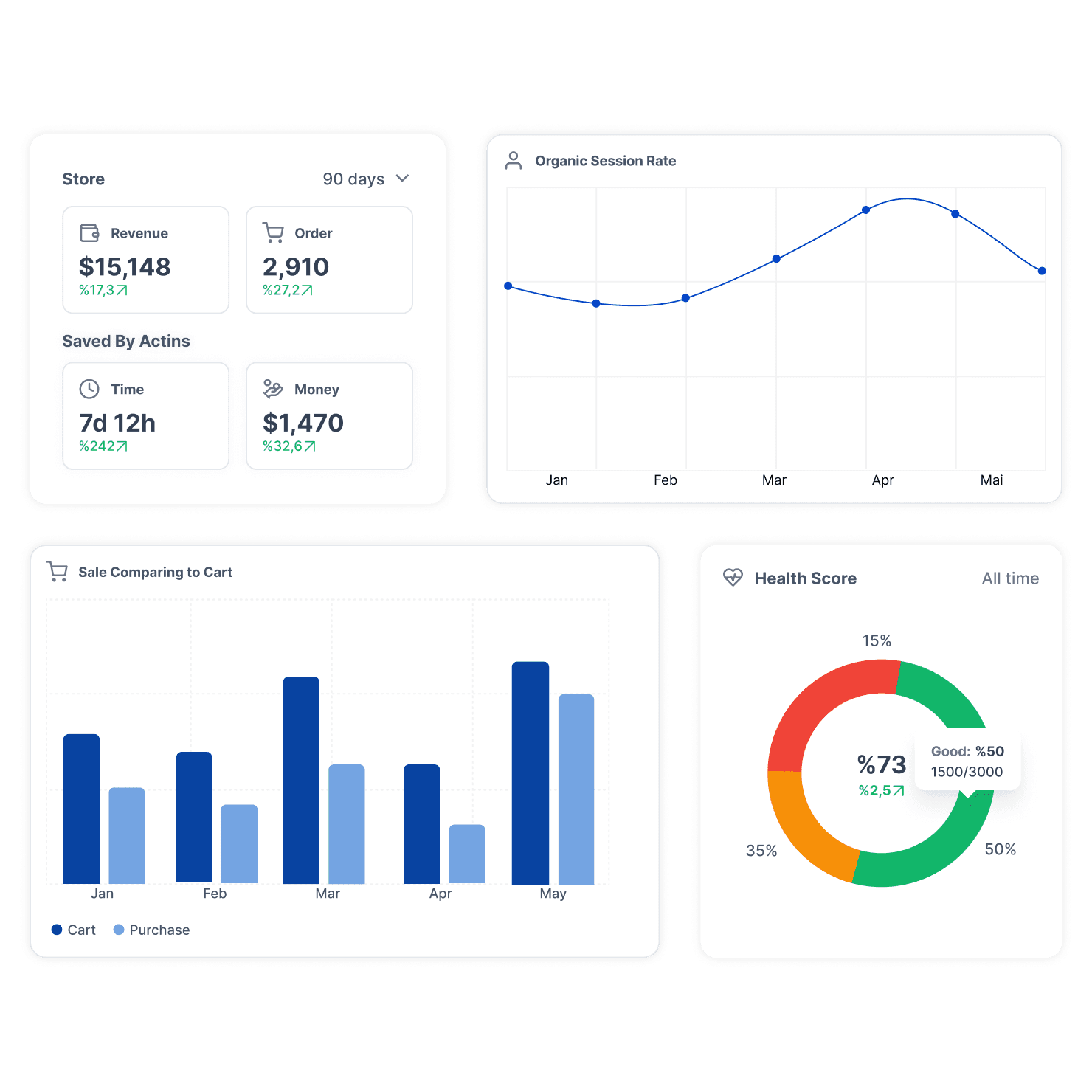 Actins AI connects to your store, analyzes what needs improvement, and instantly takes actions to boost visibility, SEO, and conversions.